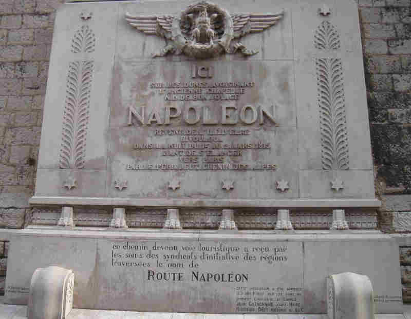 Lors de son retour de l'île d'Elbe, Napoléon Bonaparte débarqua sur la plage voisinant l'ancienne chapelle N.D. de Bon Voyage. Il bivouaqua dans la nuit du 1er au 2 mars 1815, avant de remonter vers Paris, par la route à laquelle il donna son nom "la route Napoléon". Cette stèle se trouve sur le mur de l'église N.D. de Bon Voyage.